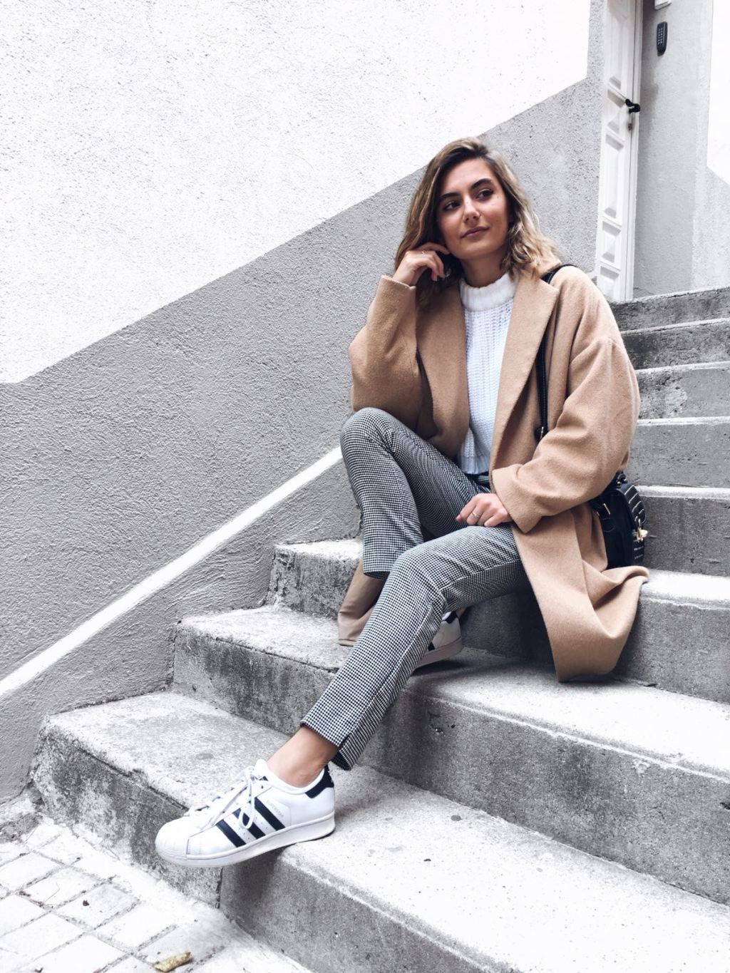 So, for today’s outfit, I went for these suit pants that I feel so comfortable in, as well as my favorite white sweater, oversized camel coat, baker boy hat, basic sneakers and some gold details such as my glasses, bag and watch.