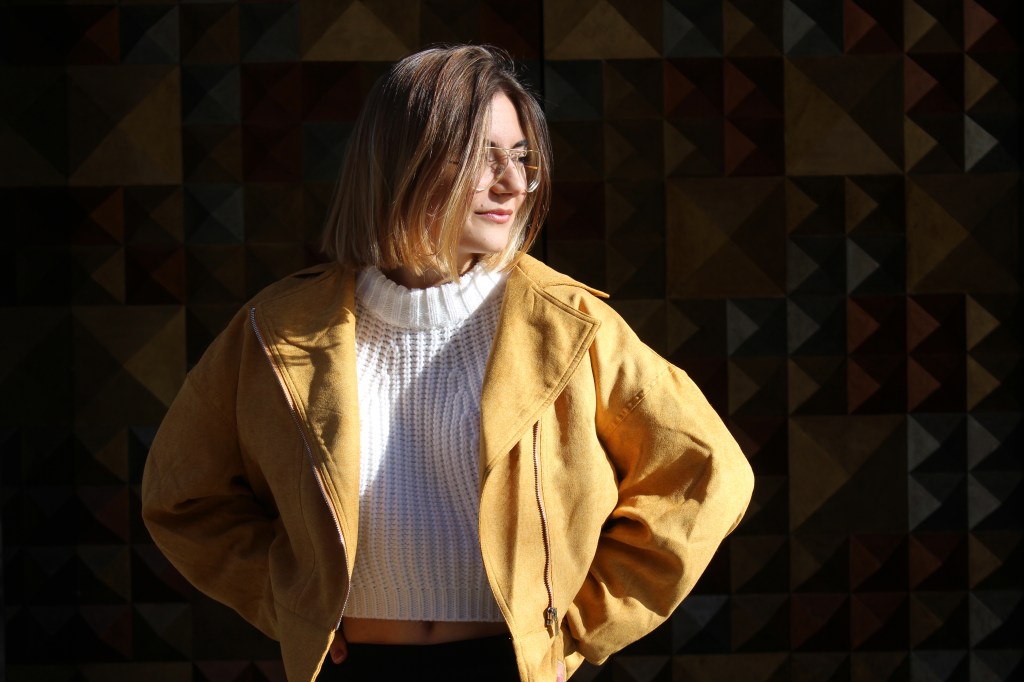Today I wanted to share with you a visual explanation of that, so you can see how amazing photos can look if you play with the light of the sun. I wanted to take advantage of the gold lightning of the sun and wear this mustard jacket from SheIn (similar here & here) to enhance the tones. Then, because I wanted to look casual and kind of vintage, I wore these beautiful trousers (a little bit flared on the bottom and with beautiful details), white sweater and basic sneakers.